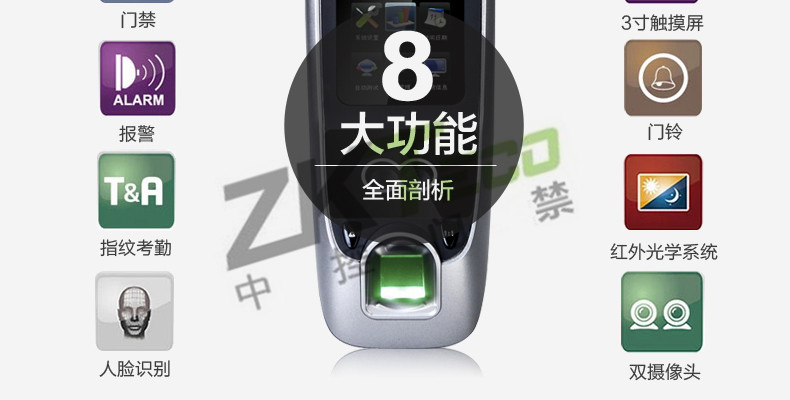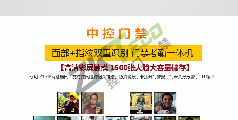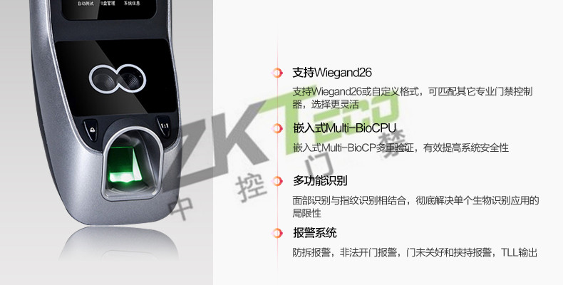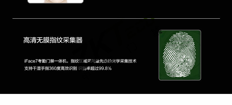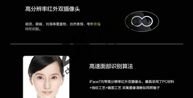 面部門(mén)禁一體機(jī)iFace7是基于ZEM800多媒體開(kāi)發(fā)平臺(tái)設(shè)計(jì)的一款集指紋和面部混合驗(yàn)證的3寸觸摸彩屏門(mén)禁終端,采用ZKFinger VX10.0最新指紋算法及ZKFace VX7.0面部算法,識(shí)別速度快,靈活選擇面部、指紋或者密碼開(kāi)門(mén)方式,集成高分辨率夜市紅外和雙攝像頭功能,適應(yīng)范圍廣。支持高級(jí)門(mén)禁功能(不同時(shí)間段開(kāi)門(mén),多人開(kāi)門(mén),拆機(jī)報(bào)警,門(mén)未關(guān)好報(bào)警,門(mén)被非法打開(kāi)報(bào)警,開(kāi)門(mén)按鈕輸入,有限門(mén)鈴接口,脅迫報(bào)警等)。標(biāo)配的TCP/IP通訊,支持跨網(wǎng)段跨網(wǎng)關(guān)連接,是安防工程的首先產(chǎn)品,可用于銀行、部隊(duì)、機(jī)場(chǎng)等高安全場(chǎng)所。